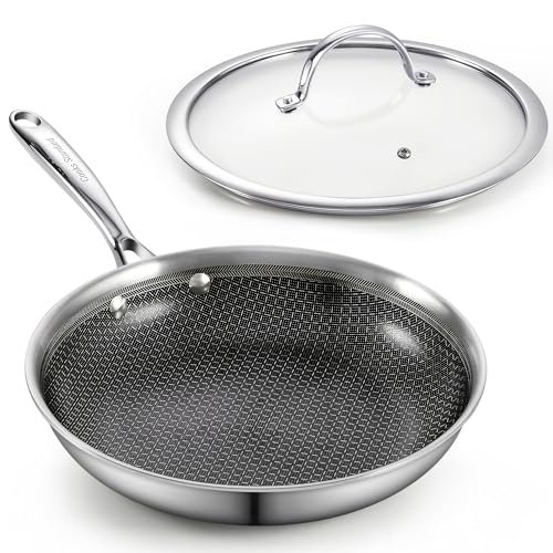 - Laser-Etched Hybrid Nonstick: The surface of the stainless steel skillet features precision laser-etched textures, combined with a health-conscious nonstick coating, providing enhanced durability, scratch resistance, and long-lasting nonstick performance