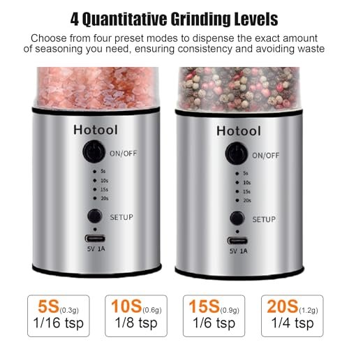 - 𝟒-𝐒𝐭𝐚𝐠𝐞 𝐐𝐮𝐚𝐧𝐭𝐢𝐭𝐚𝐭𝐢𝐯𝐞 𝐆𝐫𝐢𝐧𝐝𝐢𝐧𝐠 – 𝐏𝐫𝐞𝐜𝐢𝐬𝐞 𝐏𝐨𝐫𝐭𝐢𝐨𝐧 𝐂𝐨𝐧𝐭𝐫𝐨𝐥: Innovative 4-stage metered output lets you dispense a precise amount of seasoning every time with just one touch. Choose from 4 preset quantities based on your recipe needs—perfect for accurate cooking, healthy meal prep, and reducing over-seasoning. Ideal for both novice and experienced cooks.