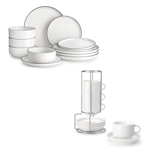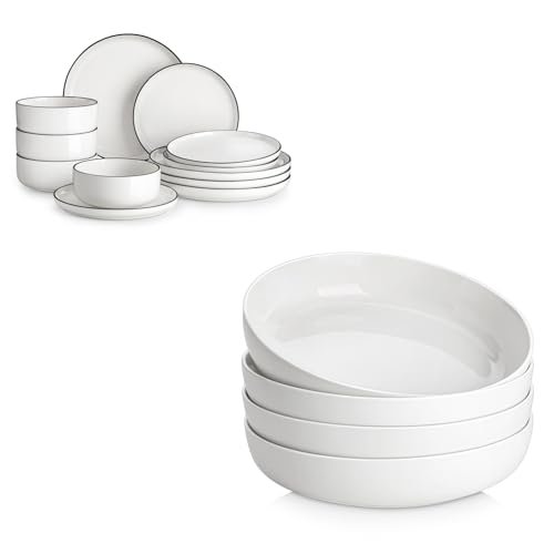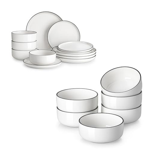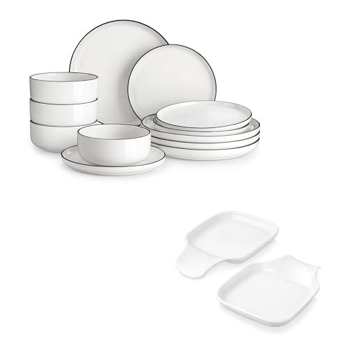 3 reviews for MALACASA Plates and Bowls Sets, 12 Pieces Modern Porcelain Dinnerware Set for 4 White Kitchen Dinner Dining Ware Set wtih Black Rim Ceramic Dishware Dishes Microwave and Dishwasher Safe, Series LUNA