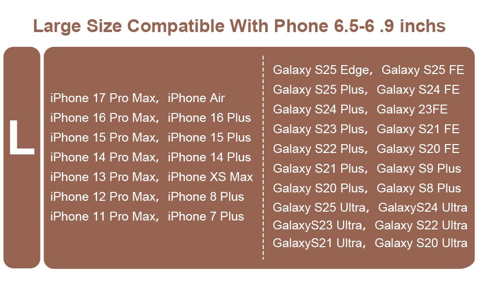 - [Wide Compatibility] :This phone pouch measures 6.7 * 3.4 * 1.2 inches and is designed to fit iPhone 17/16/15/14/13/12 Pro Max & Plus models and Galaxy S25/S24/S23/S22 Ultra & Plus, including FE models. It accommodates most smartphones with protective cases, offering a snug, secure fit for a wide range of devices.