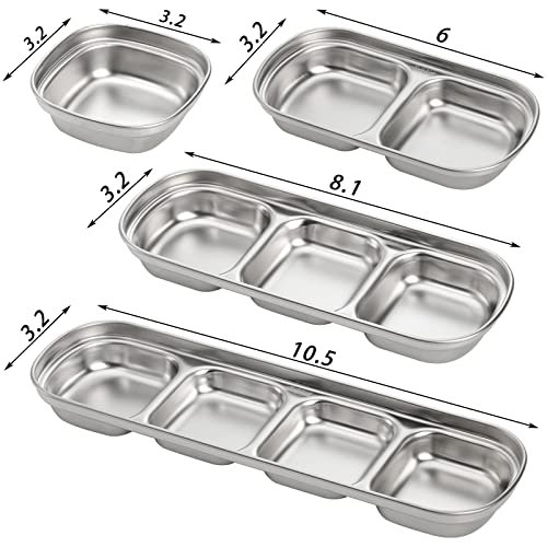 SOUJOY 4 Pcs Stainless Steel Sauce Dish, Divided Seasoning Sauces Dip Bowl, 1/2/3/4 Compartment Korean Ketchup Sauce Bowl, Vinegar Soy Spice Condiment Tray for Home Restaurant